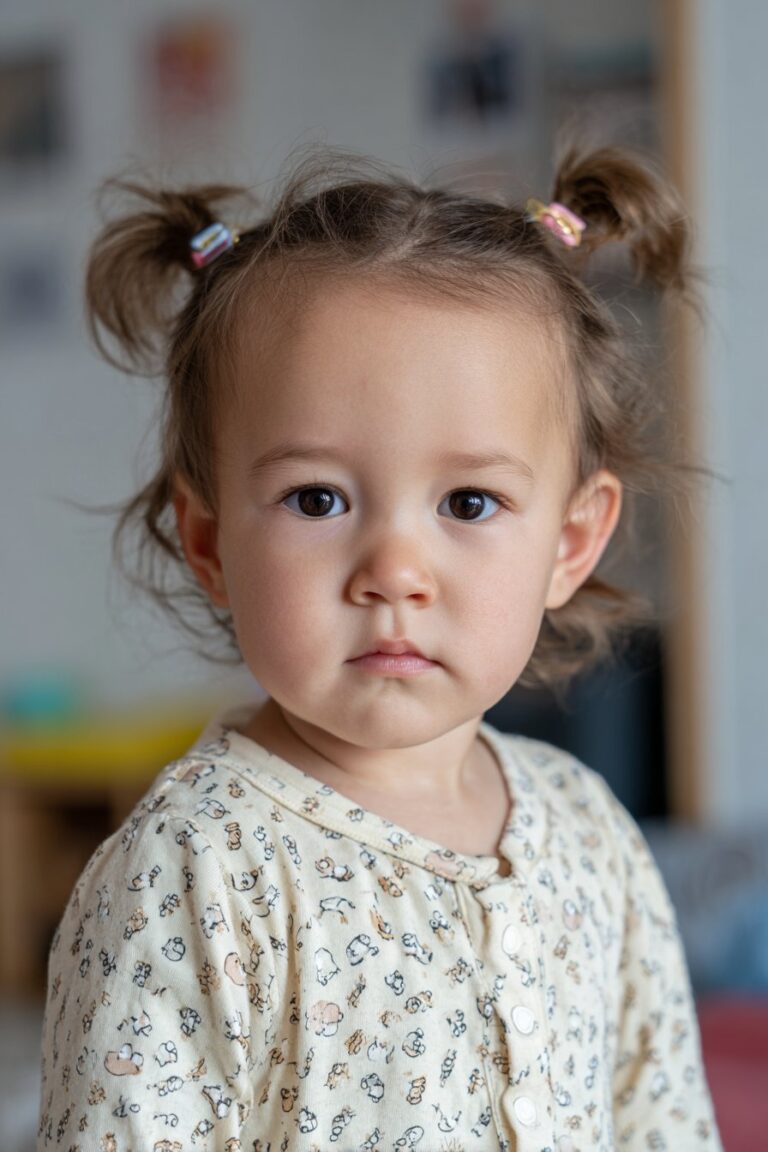 This style features hair vertically parted into two sections, each gathered and secured with elastic bands on either side of the head. The result creates two small ponytails or gathered sections that frame your baby’s face symmetrically. Hair is well brushed and packed with rubber bands, creating neat, defined sections. The look can be dressed up with bows or kept simple with colorful elastics.